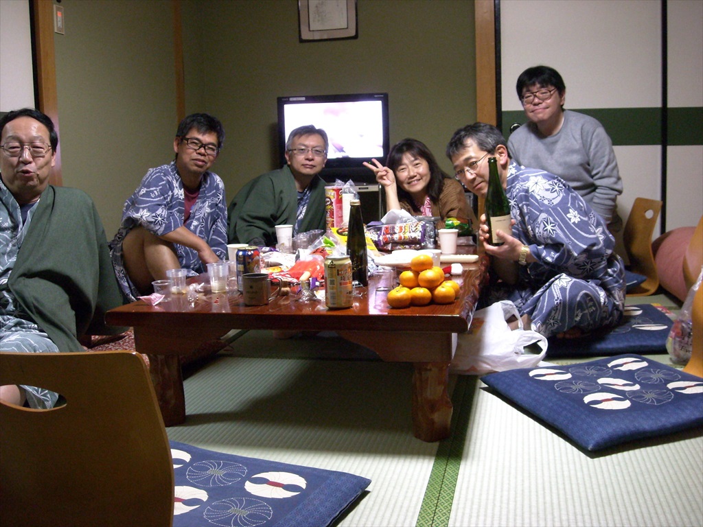 バスや電車や車など、思い思いの手段で旅館へ向かい、全員が到着したのが16時30分頃。その後温泉に入り夕食を食べ深夜12時頃まで宴会。酔っ払ってもすぐ寝ちゃえるのがサイコー。