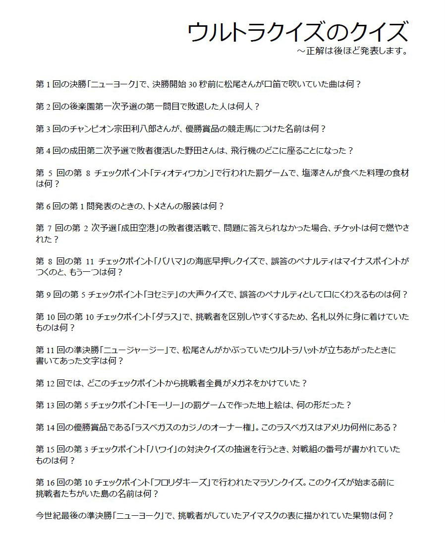 掲載した「ウルトラクイズのクイズ」ですが、私は7,13,14,15,16,以上5問が不正解(またはわからない)でした。